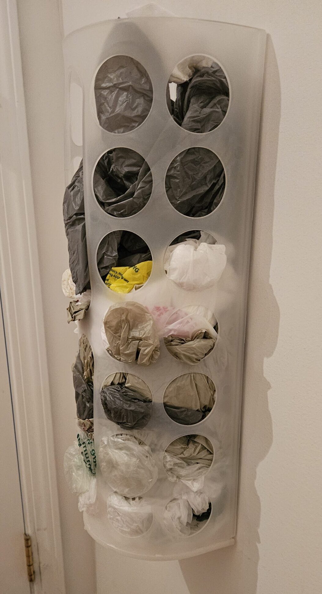 I actually know what this is and had one in my home. But since plastic bags have gone by the way of the dinosaur, so have these plastic bag distribution containers. I know I purchased mine in Ikea decades ago. Had it hanging on the basement wall, near the light switch. As I move through people’s homes with them, during a downsizing or senior move project, we often see these in the exact same spot. This one, filled with plastic bags, was also on the wall at the top of the basement stairs.